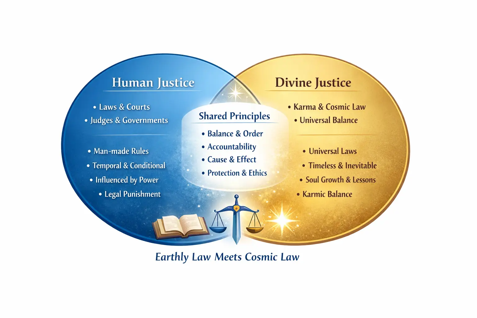 Divine or cosmic justice operates on a much larger scale than human justice. It functions through universal laws such as balance, cause and effect, and what many traditions call karma.